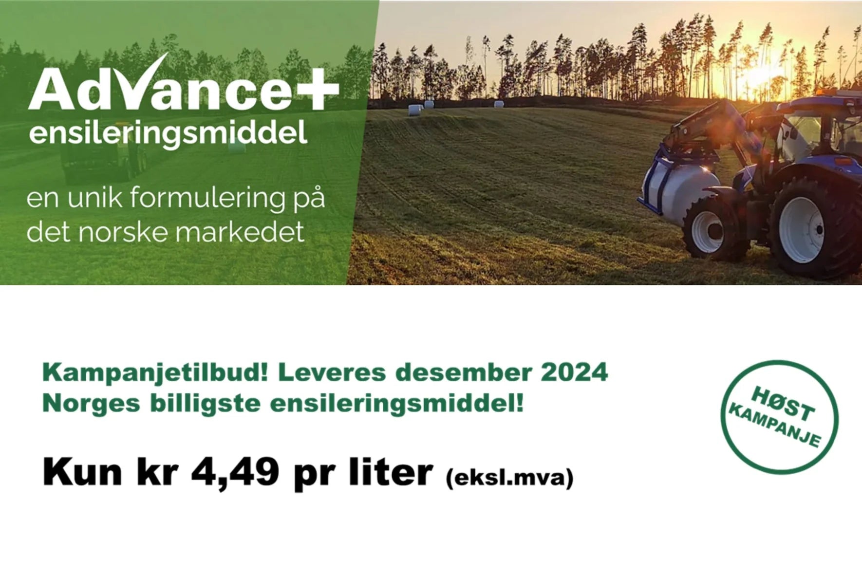 Hvis du vil investere i fremtiden til gården din, er Advance+ det riktige valget. Med forhåndssalg og levering i desember, er nå et godt tidspunkt å sikre seg dette ensileringsmiddelet til den beste prisen. Gjør deg klar til å gi dyrene dine det beste grovfôret – og sikre bedre melkeproduksjon, dyrehelse, og økonomi for din gård.
