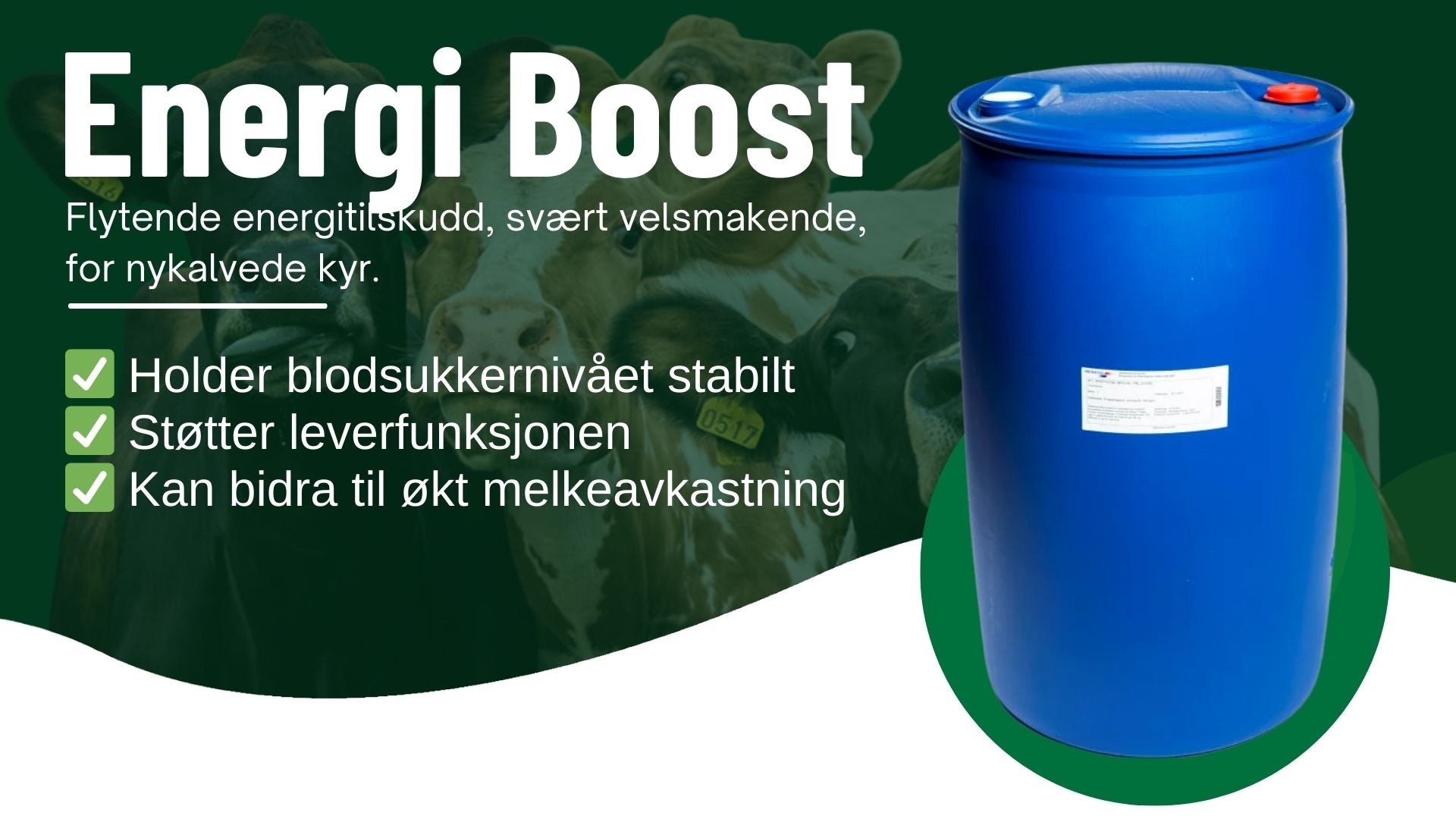 For å sikre en god start på laktasjonen og forebygge ketose og leverforfetting, er Energi Boost et effektivt og lett tilgjengelig verktøy for melkeprodusenter. En stabil energiforsyning er avgjørende for kuas helse, fertilitet og melkeytelse – og Energi Boost leverer nettopp dette!
