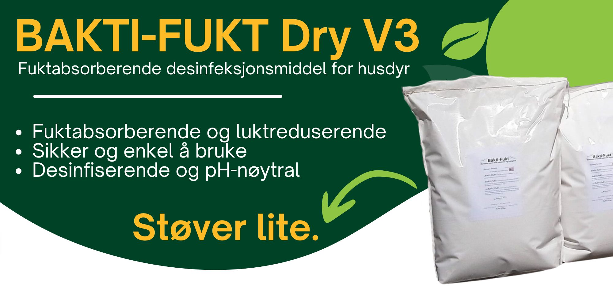 Bakti-Fukt DRY V3 er et fuktabsorberende desinfeksjonsmiddel som brukes i husdyrrom for å bekjempe fukt og forhindre spredning av bakterier, virus og parasitter. Dette produktet har blitt utviklet med tanke på både effektivitet og sikkerhet, og det kan brukes i ulike typer husdyrproduksjon som fjøs for storfe, sauehus, grisefjøs, fjørfehus og hestestaller.