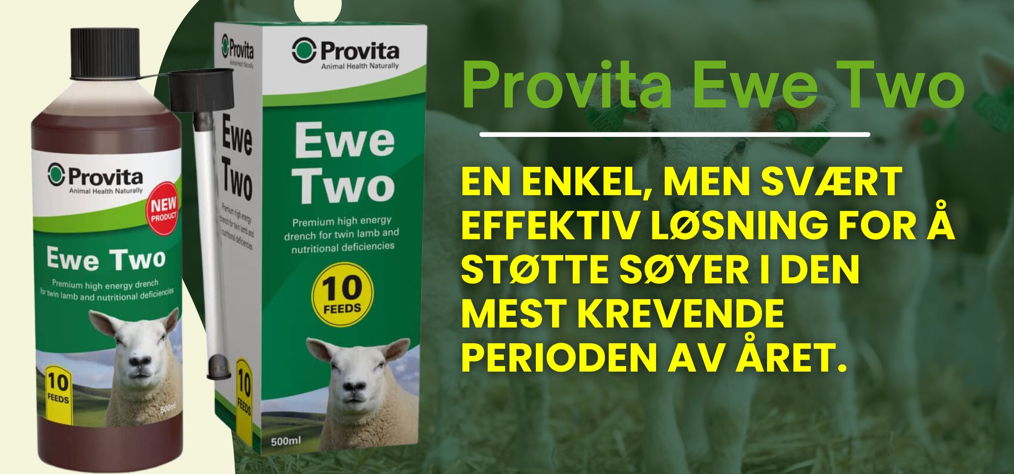 Provita Ewe Two er et hurtigvirkende, høyenergi-drench som er spesielt utviklet for søyer med flere lam. Produktet gir en umiddelbar energikilde og inneholder 14 essensielle mineraler og vitaminer, inkludert høye nivåer av kobolt, selen, jod, jern, B12 og vitamin E. Dette bidrar til å forebygge Twin Lamb Disease og melkefeber, samt gir søyene økt energi i en krevende periode.