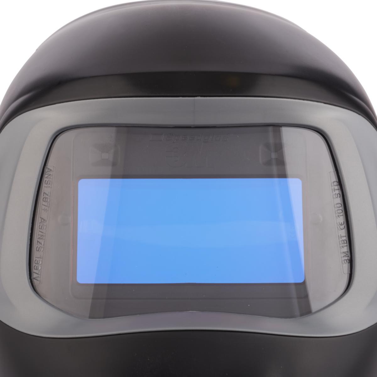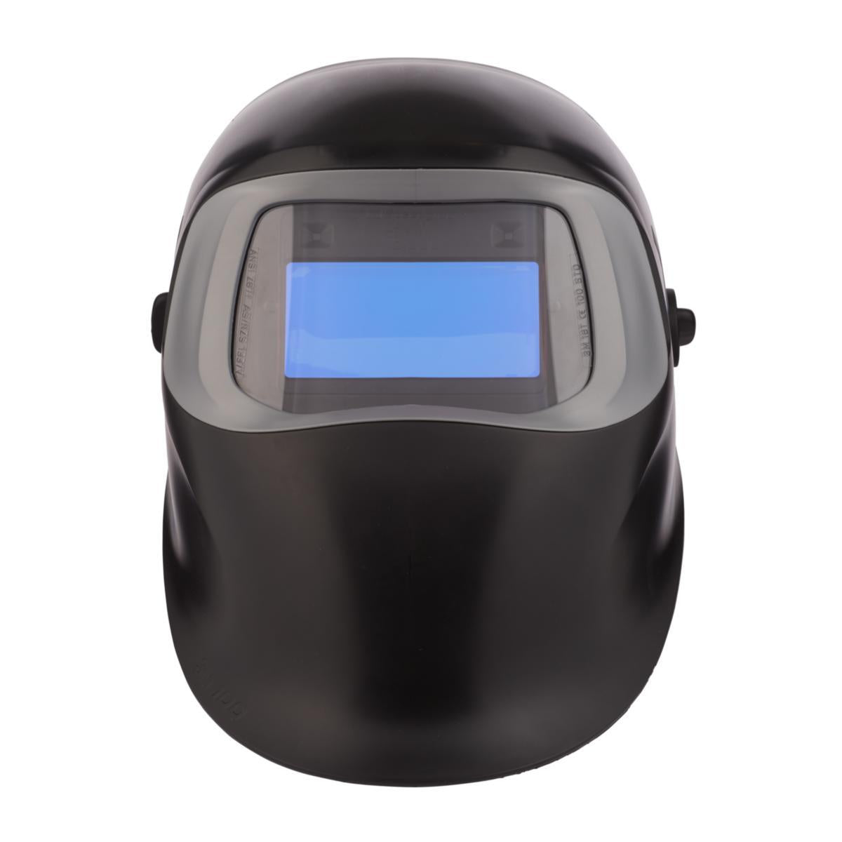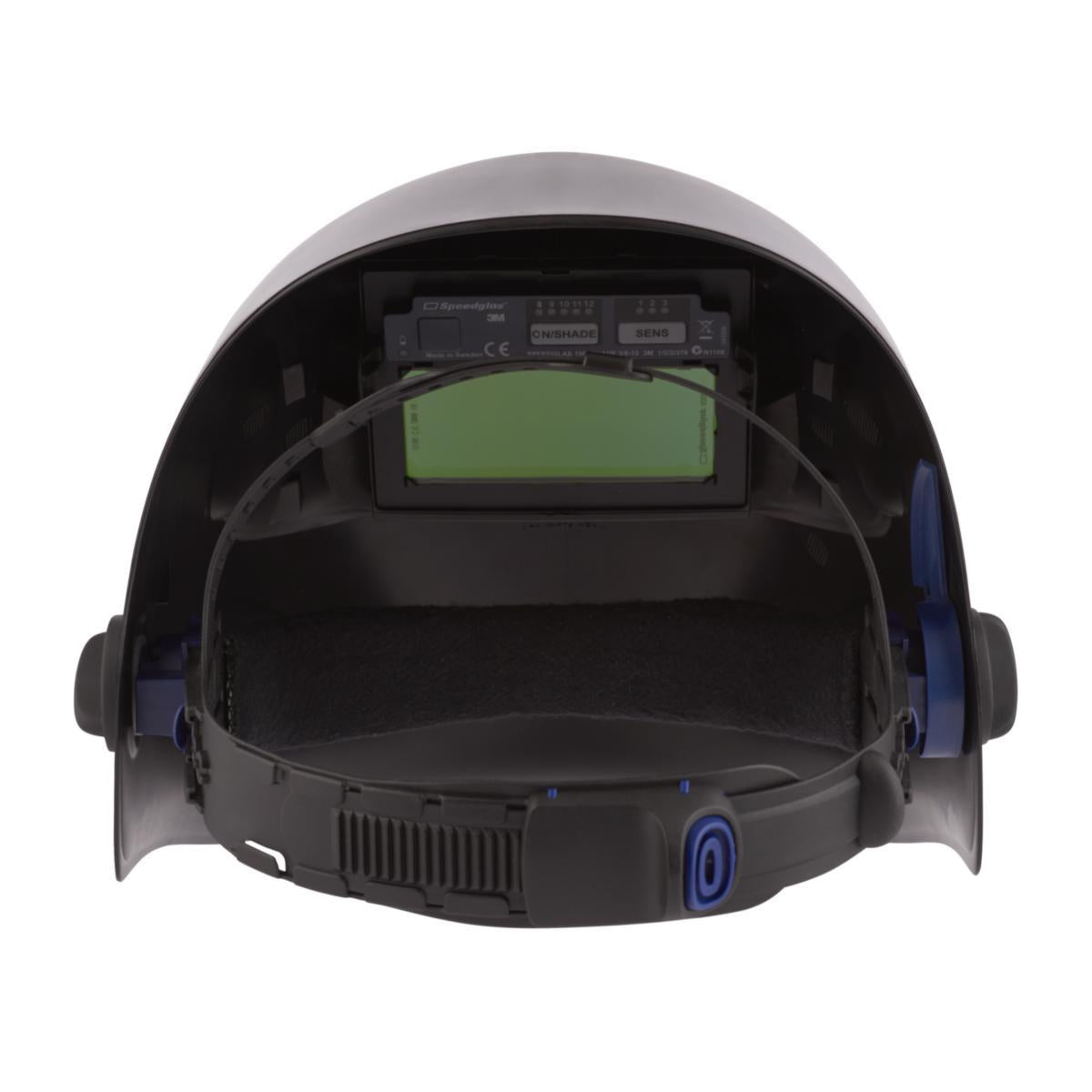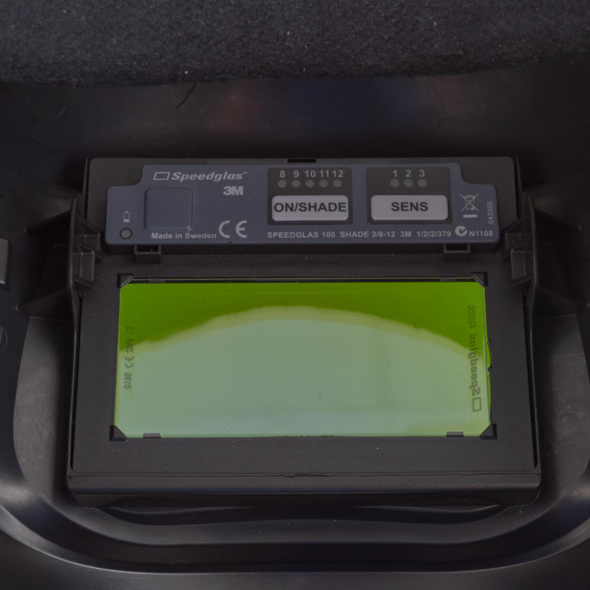 Sveisehjelm med automatisk nedblendende Speedglas sveiseglass på 100V i fem ulike formørkingsstillinger.