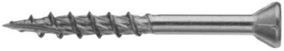 Skarp spiss og gjenger tilpasset for forankring i tre. Gjengene griper omgående og drar inn skruen i bordet, samtidig som rillene under hodet forsenker skruen. Skruens unike tildragningsegenskaper blir oppnådd med en skjærende borspiss, samt langsgående skjær mellom gjengene som effektivt driver skruen ned i trevirket og motvirker sprekkdannelse. Passer ved montering av trykkimpregnert, edeltre, bord, altaner, brygger, stakitt m. m. TX-20. Syrefast stål (A4). Korrosivitetsklasse C5, for utendørsbruk. Skrutrekker med dybdeanslag anbefales, senk hodet ca 2 mm. Dimensjonering Ca 30 st/m².